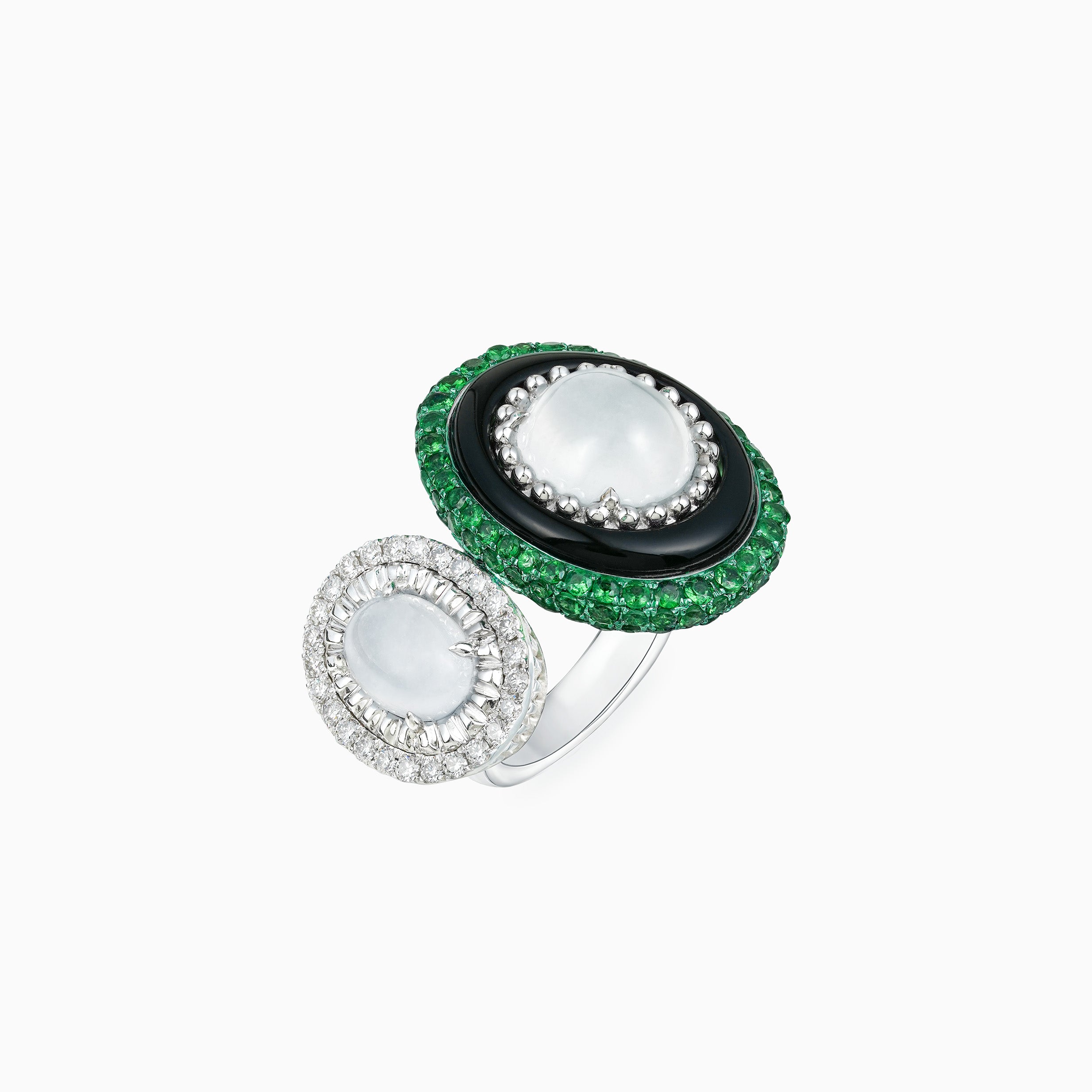 18K White & Green Gold Jade, Onyx, Green Garnet & Diamond Ring