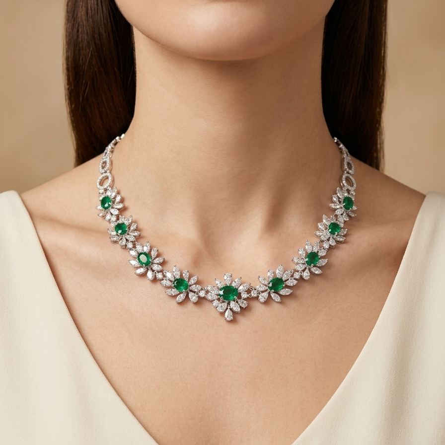 18K White Gold Emerald & Diamond Necklace