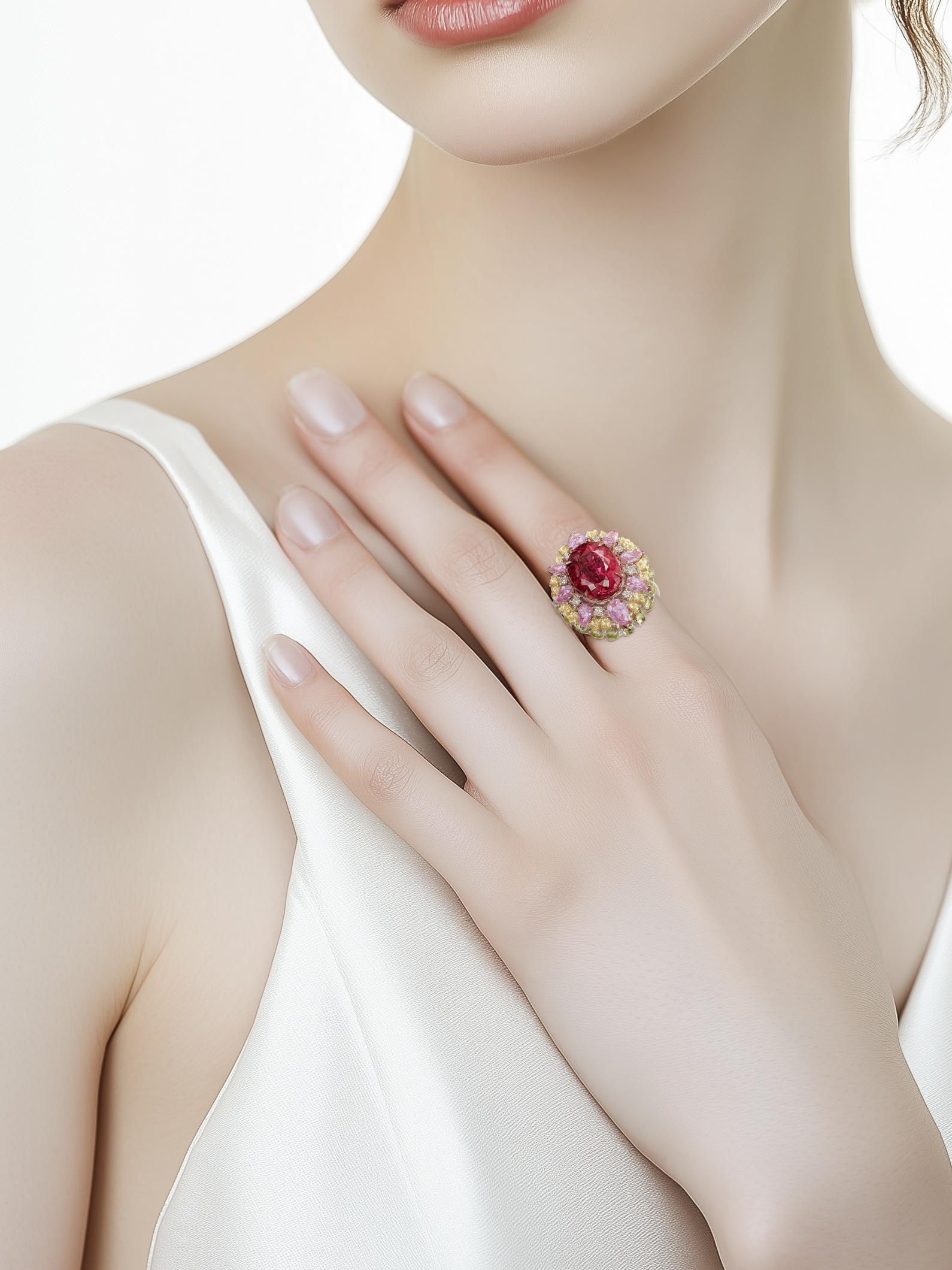 18K White, Yellow & Rose Gold Rubellite, Sapphire & Diamond Ring
